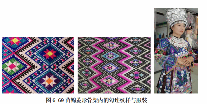 苗锦的纹样布局多以寓意吉祥的花草、动物,排列在几何形、菱形的框架内,装饰风格较为粗犷,动物纹是苗锦图案的主要内容,如龙纹、牛纹、蝴蝶纹等,反映出苗族的多神信仰和祖灵崇拜。纹样是正方形或菱形适合图案。菱形内纹样繁复勾连,变化中有统一,配色对比强烈,装饰感强,与整体构成骨架的直线风格统一,很有力度感。苗锦纹样和服装如图6-69。苗锦纹样“或在素底上织彩,或在彩底上织素”,图案色彩浓艳而富丽,对比强烈而调和。
