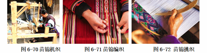 苗锦挑织工序:将牵好的经线上筘,并引进“线综”(织布时使经线交错上下分开,以便投梭引进纬线的装置)上机后,用一块长约一尺、宽约五分的光滑竹片,按照花纹需要,向经线逐一挑通,然后投梭引进一根花纬,拉筘打紧纬纱。接着利用综线交错上下分开经线,织一根地纬。第三根纬线仍为挑织花纬,如此循回织成的宽锦,称为挑织,可以通经通纬或通经断纬,如图6-72。