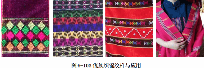 独特的色彩和纹样构成佤锦的独特风格,在织锦色调中,以黑色和红色为基本色,穿插黑色或彩色棉线形成条纹或方格,黄、绿、白、蓝相间,粉色、棕色为辅助色,颜色呈深浅变化;花纹以直线平行线方形三角形菱形等组成连续的几何花纹,有条纹、菱形纹、十字纹等,线条流畅,视觉突出,像一道炫目的彩虹。阿佤人世代居住在大山里,同大自然建立了深厚的感情。花纹中的绿、红、黄、蓝、紫等色是与动植物有密切相关的。所织图案呈现着佤山天地、山水、村寨、河流、森林、花草、鸟兽、云霓等融成的如画的自然美景和阿佤人富有诗意的衣食住行、信仰、风俗等情景。款式别致,结构协调,反映出佤族人民丰富多彩的精神世界,堪称佤族有形文字的代表,反映了佤族人民“万物有灵”的原始自然崇拜理念。佤锦纹样和应用如图6-103。