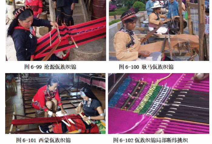 佤锦的织造也采用原始腰机踞织的方法,织造者席地而坐,把经线一端系在腰部的背皮,一端系在房柱或树上。竹质综杆分经形成开口,用若干木棍或按细竹棍规律挑压经线,用梭引纬,用打纬刀打紧,纬纱织六行加入一根粗棉线,使其突起,更有立体感。织出的佤锦幅宽约50-70cm左右,一般6、7m长。如图6-99至图6-102。