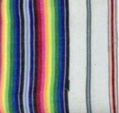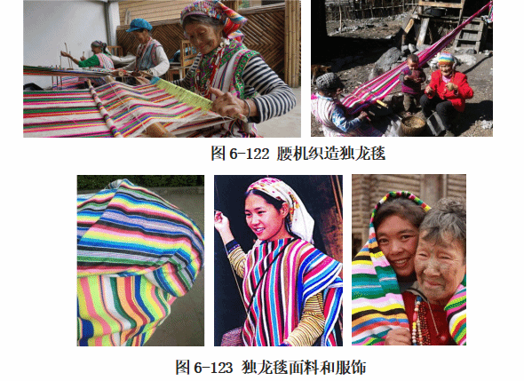 独龙毯是独龙族妇女在原始的腰机踞织上成的,经线用不同颜色经纱,排列成各种颜色的条纹,各条纹宽窄不等。织造时,织造者席地而坐,面对经纱,腰缠皮带,用身体的力量控制纱线张力,手提综杆,形成梭口,引入一根纬纱,打纬,利用纱线张力和分经杆形成下一次梭口,再引入一根纬纱,打纬,织造一段时间后,调节送经轴与卷布轴。每幅约20cm,几幅缝制成片即成独龙。织造方式如图6-122,面料和服饰如图6-123。