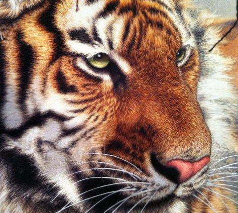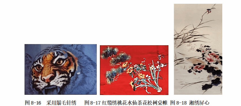 湘绣作品特别强调颜色的阴阳浓淡效果,其作品一般采用套针,正抢针、齐针等技法绣制,花纹图案风格文雅,有国画之味道,用色比苏秀艳,但又不如广秀艳。绣品大部分分为插屏、挂屏心,图案以竹石、花鸟为多。以着色富于层次,绣品若画为特点。湘绣还以特创的“鬅毛针”绣雄狮猛虎等大型动物,体现出猛兽的威武雄健和毛丝刚经的形态特征。固而湘绣有“绣花能生香,绣鸟能听声,绣虎能奔跑,绣人能传神”之美誉。如图8-16湘绣《虎》,