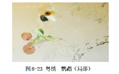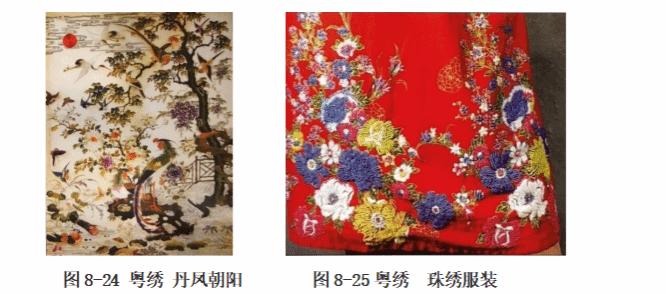粤绣泛指以广东为中心的刺绣品,为中国四大名绣之一,粤绣又称“广绣”,包括以广州为中心的“广绣”和以潮州为代表的“潮绣”两大刺绣流派。粤绣的历史悠久,据传最早起源于少数民族,和黎族的织锦同出一处,粤绣的色彩繁多,针法变化丰富,针步均匀,纹理分明,善留水路。粤绣的制品品种丰富,功能实用类的制品主要有床上用品,如被面、枕套、床楣、绣衣等。欣赏类的艺术装饰品主要有台屏、挂屏和条幅等。粤绣的刺绣题材多以写生花鸟和动物为主,如凤凰、牡丹、松鹤等(图8-23、图8-24)。
