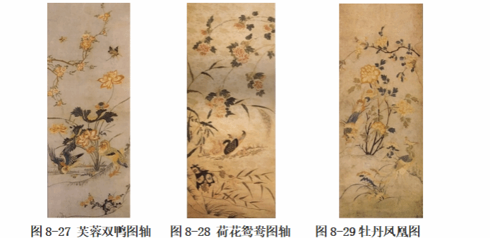鲁绣与南方刺绣相比较为粗犷,色彩也浓烈,牢度强而耐磨,构图自然生动,代表着北方的刺绣风格,也被人称作“北绣”。传世经典的鲁绣作品,有明代的《芙蓉双鸭图轴》(图8-27)和《荷花鸳鸯图》(图8-28)等,鲁绣针法质朴健美,风格豪放坚实,是很具特色的刺绣。
