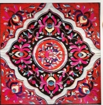苗绣是贵州、湖南、云南、湖北、海南、广西等苗族地区的刺绣。苗绣技法有平绣、绉绣、结绣、辫绣、卷绣、挑花、打籽等十余种,一般用剪纸花作纹样,也有信手绣的图案,色彩构图都会事先设计,揭示生活中熟悉的形象。清水江边的苗族常取水中鱼、蛙等纹样;住在山地的苗族则多用植物、蝴蝶(图8-36)、鸟类以及几何纹,造型夸张有趣,如鱼的头,圆圆的身体肥大,嘴小眼宽,形象可爱。苗绣常用于衣襟、衣袖、腰带、围腰、小孩背扇、帽子、鞋花等生活用品。如苗绣挑花腰带流行于广西南丹,妇女自织自染青、黑色土布做底部,上面绣上十字挑花图案,取几何形纹样,组合多样,富于变化,疏密有致,装饰鲜明。再如苗族衣袖花流行在贵州雷山、凯里等地,是一种妇女服装的衣袖刺绣品,分头片和正片,头片多用两条几何纹样花边组成,正片才是纹饰主要部分,图案有九龙袖、飞鸟袖、石榴袖等十余种。图案名称可顾名思义,例如龙绣就是以龙为主型,象征吉祥光明神圣,分别还有龙鸡袖、盘龙袖、龙钱袖等,千姿百态,古拙可爱。飞鸟袖以千变万化、婀娜多姿的飞鸟形象构成,图案生动活泼情趣盎然,石榴袖以石榴形做轮廓,用编织的花带沿着外形绣钉,内点缀其他花样,四周添绣少量花纹,图案严谨统一。