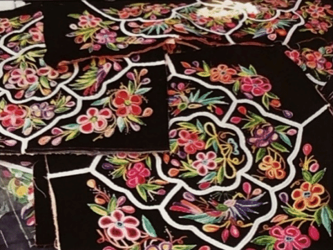 壮族刺绣流行广西壮族自治区,。尤以龙州县城关镇为盛,历史也最悠久。喜用黑、枣红、深绿为底,将剪纸花样贴在绣料上,而后用平针、戗针、盘针等针法绣制,图样喜用二龙戏珠、独龙、双凤朝阳、凤穿牡丹、狮子滚球及蝴蝶、花鸟、万字、人物等,造型简练,生动活泼,色彩对比强烈,艳丽悦目,常用以绣花鞋、花帽、胸兜、帐帘、坐垫、荷包和壮剧服装等。图8-40为色彩对比强烈的壮族刺绣绣片。 图8-40 色彩对比强烈的壮族刺绣