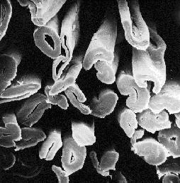 图2-21(1)蚕丝纵向形态 图2-21(2)蚕丝横向形态