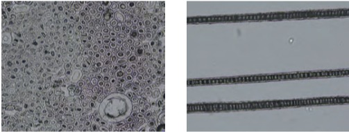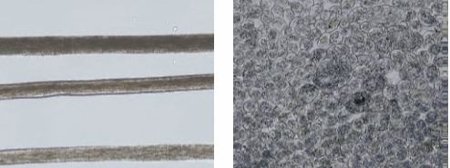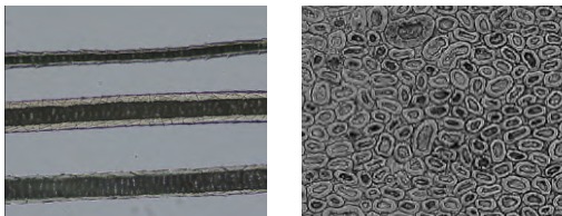 图2-13(1)马海毛纤维纵向形态 图2-13(2)马海毛纤维横向形态