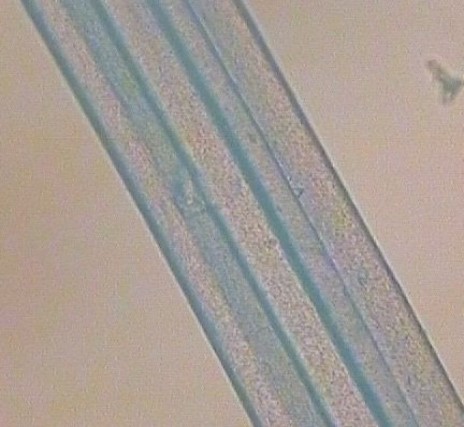 羊驼毛纤维横截面为圆形至椭圆形,髓质狭窄且连续大多由鳞片层、皮质层和髓质层组成。通过显微镜和细度仪观察鳞片呈环状或斜条状。羊驼毛的髓质层是贯通的,根据这一特点比较容易和其它特种动物区分开来。显微镜下观察羊驼毛纤维形态如图2-15。