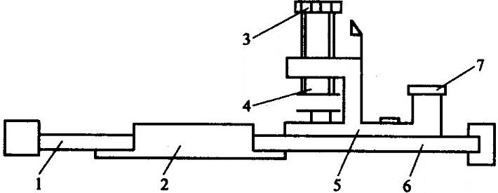 图2-4哈式切片仪结构 1-左底板 2-侧支架 3-匀给螺钉 4-匀给器 5-匀给架 6-右底板 7-定位螺栓 |