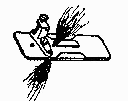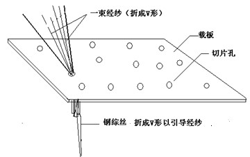 (1)将一束经纱合并弯成U形, 用对折的金属丝将经纱束弯折成V形,如图2-6,类似穿针引线的方法带过金属板的圆孔,如图2-7,注意要使得纱线束充分充满整个金属孔,即纱束通过金属孔时应该具有很大阻力,勉强通过为宜,这样大大增加了金属孔内壁对纱束的向心作用力,避免孔内纱束在刀片切割力作用下从孔中脱出。
