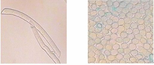 图2-16(1)兔毛纤维纵向形态 图2-16(2)兔毛纤维横向形态