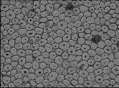 铜氨纤维的横向截面形态与莱赛尔几乎相同,故二者形态比较难区分,莱赛尔纤维的纵向条干更为立体、厚实,部分纤维表面有细小刻痕,铜氨纤维的纵向条干更为细腻、柔和,一般没有刻痕。显微镜下形态如图2-29。
