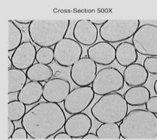 腈纶纤维纵向平滑,有1-2根沟槽或条纹,干法纺丝横截面呈哑铃型,湿法纺丝接近圆形到豆形,再到稍具细齿。显微镜下典型形状见图2-25。