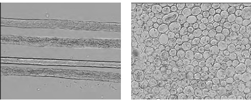 图2-9(1)棉纤维纵向形态 图2-9(2)棉纤维横向形态