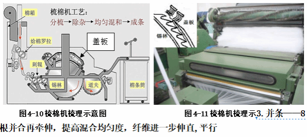 混棉和开棉后的纤维以棉卷形式(如图4-7)送至梳棉机,如图4-8,或者从斜槽喂棉箱送至梳棉机,图4-9。纤维是随机排列的,可能含有不适合进一步加工的杂质和短纤维。梳理过程示意如图4-10,梳棉机由一个大的旋转圆筒(锡林)和其上方的一系列平板(盖板)组成,锡林上覆盖着金属针或金属齿。盖板形成一个环形带,由矩形板编织在一起,上覆盖密集的细钢针(锡林和盖板针齿间配合如图4-11的左上角图),在梳棉机锡林上方旋转。锡林和盖板以相同的方向旋转,但速度不同,将纤维梳理成薄的薄膜状的网。在这个过程中,短纤维和杂质被清除并沉积在盖板上。留在梳棉机锡林上的纤维部分平齐,因此它们的纵向轴线方向和梳棉网的长度在一定程度上平行。薄纤维网被从锡林上拉出,聚集成一定质量柔软的纤维,然后通过锥形或喇叭形集结器,收缩产生一条绳状的细条,如图4-11。棉条没有捻度,只有一点强度,这是由纤维的缠结提供的。强度足以使棉条脱离并落入棉条桶中或放置在输送机上,以转移到下一个加工步骤,即牵伸工序。