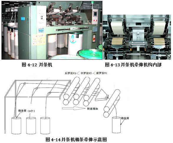 并条机(图4-12)使用一系列成对排列并以不同速度旋转的罗拉牵伸棉条。在第一并条机上,将几条梳棉条(通常为八条)组合在一起,以进一步混合纤维。棉条通过一系列的罗拉从机器的后部拉出(图4-13)。后一对罗拉的旋转速度低于机架前部的一对罗拉(图4-14)。由于棉条的卷绕速度比输送速度快,所以棉条在拉出或牵伸时会变薄。仅经过一次牵伸的梳棉条和精梳棉条都要经过末道并条,进一步混合和使纤维定向排列。在某些情况下,会进行第二次末道并条。通过一系列罗拉的牵伸,这个操作在所有过程中都是相同的。对于细支纱线,更高的牵伸产生更轻的棉条是可能的。牵伸后,纤维处于最平行的排列状态。须条并没有捻度,尽管须条(回转状态)在落入棉条中时可能有加捻现象发生。在这一点上,环锭纺纱经过粗纱过程;其他短纤纱直接由并条后的棉条牵伸而成。