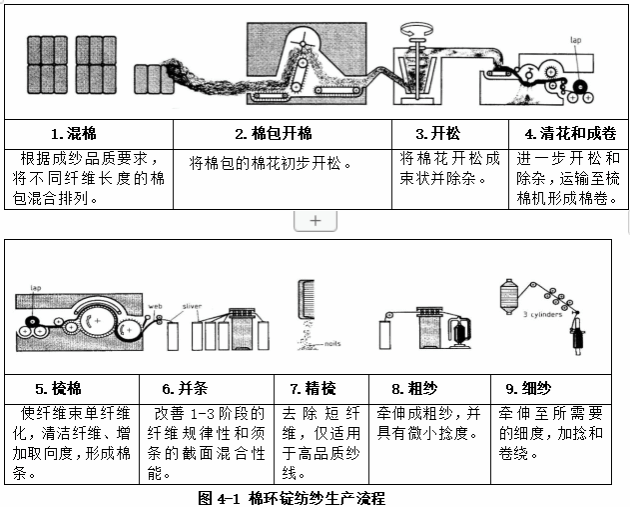 棉纺本质上是一个不连续的过程,在这个过程中,短的原纤维经过一系列的机器,将其转化为连续的纱线。环锭纺纱的主要生产阶段是开松、混棉、梳棉、并条、粗纱和细纱(包括加捻和卷绕)。棉环锭纺纱过程如图4-1所示。