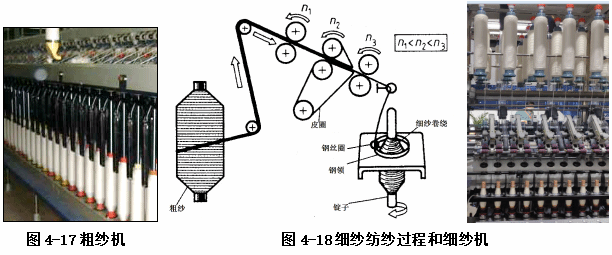 来自末道并条的棉条被排列组合并移动到到粗纱机(如图4-17)机后,在粗纱机上通过三对以不同速度旋转的罗拉将棉条牵伸到其原始直径的八分之一左右。第一组以相对较慢的速度转动,中间组以中等速度转动,最后一组的速度大约是第一组速度的10倍。这会将纤维拉出,减小纤维束的直径,并使纤维获得一些额外的平行排列。粗纱被缠绕在线轴上。缠绕过程会产生少量的扭曲,这会增加的强度。粗纱筒子被落下,并转移到细纱区。