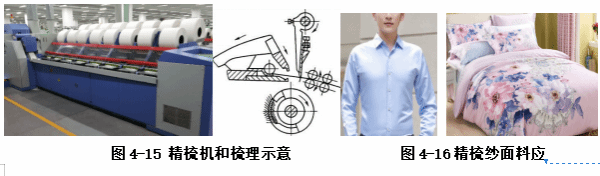 精梳是一个关键过程,它决定了普通纱线和优质纱线之间的区别。它使最终的纱线比其他纺纱系统的细纱更光滑、更细、更结实、更均匀。精梳纯棉正装衬衫和采用精梳纯棉贡缎的家纺床品应用如图4-16。