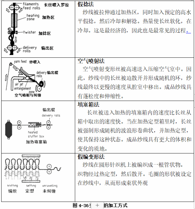 合成纤维具有热塑性,长丝在热和机械作用下,经过变形加工使之具有卷曲、螺旋、环圈等外观特性而呈现蓬松性、伸缩性的长丝纱,亦称为变形丝,包括:高弹变形丝,低弹变形丝,空气变形丝,网络丝等,达到如下目的:增加体积、增加了延展性和弹性、光泽柔和、由于纤维内封闭的空气、隔热效果更好,柔软舒适。变形丝的不同加工方式见图4-36。