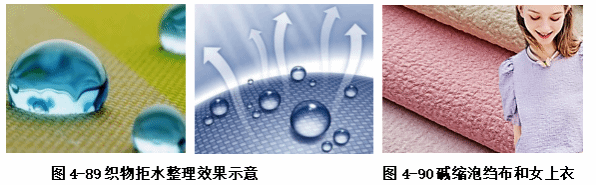 (3)拒水整理:“拒水”和“防水”的概念不能混淆。拒水织物允许气体而非水透过,它仅阻止水的穿过而不是完全防水,如图4-89。任何穿着舒适的衣服必须透气。由于没有气体流动,防水整理使穿着者感到不自在和不舒服,织物经拒水整理后,能驱开液态水,但保留了空气的可渗透性,这是一个重要的舒适性因素,使成衣内部不会变得潮湿、不舒服,而这些都与热损失有关。