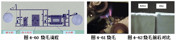 火口安排为织物在火焰上通过一次,即可得到一面或双面烧毛。烧毛速度可随织物的不同种类,以及煤气火口的数目和热量强度而有所不同。一般说来,气体烧毛机每分钟烧毛约80-140 m。气体烧毛流程如图4-60,烧毛过程和烧毛前后对比如图4-61和4-62。