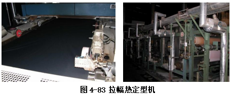 大多数化纤制成的机织物或针织物均需在前处理、染色或整理过程中的某一阶段进行热定形处理。热定形的主要目的在于消除机织或针织时所产生的应力;减少湿处理时产生的折皱,使织物获得高度的尺寸及形态稳定性,以满足后续加工和成品的需要,并且改善织物的可染性。为了取得满意的定形效果,必须在织物处于“最佳”尺寸时对它施加足够的能量,以削弱和拆开链间的作用力,形成新的分子间作用力。拉幅热定型机如图4-83。