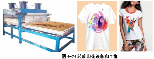 也称热转印,先将某种染料印在纸上,再用热压等方式,使花纹转移到织物上的一种印花方法。多用于化纤针织品、服装的印花。转移印花经过染料升华、泳移、熔解、油墨层剥离等工艺过程,热转移印花机和转移印花T恤,如图4-74。