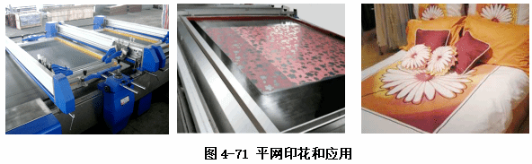 平网印花也称筛网印花,采用筛网局部镂空方式进行色浆印花,如图4-71。印花前要先制镂空筛网花版,套色数等于花版数。制版是准确地将要印制的花型先进行分色,并找出循环单元。将每一花型上的同一种颜色印制在同一筛网上。使花型部位镂空,并将非花型部位网眼堵住,以防印花时色浆转移到织物上去。常用的制版方法有防漆法、感光法和蜡刻法。现各染厂主要采用感光制版。
