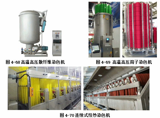 (4)纤维染色:纤维是以短纤或纤维条的形式在染色釜中染色,如图4-68。染色釜可分为两类:工作温度达到100℃和超过100℃。染色釜基本由装染液的金属容器和装纤维笼子构成。染色通过染液流过纤维进行,纤维排列确保其整体浸渍均匀,通常,纤维固定而染液循环。这种循环可防止纤维纠缠。