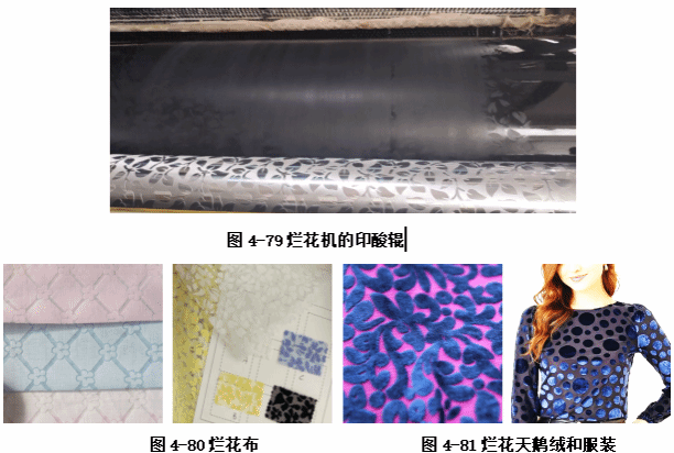 烂花织物一般以涤纶长丝为芯,其外包覆棉(或黏胶)短纤维的包芯纱,织成坯布后印酸性色浆花纹,再经焙烘与水洗,用酸蚀去浆印部分的棉或黏胶而留下耐酸的涤纶长丝,形成半透明花纹的烂花布,具有“局部透明、挺爽、透气、立体凹凸”的风格,它和皮肤接触的是外包的棉纤维,穿着舒适。烂花机如图4-79烂花布如图4-80,烂花天鹅绒和服装如图4-81。