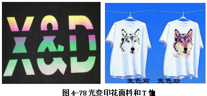 也称彩虹印花,在染料中加入数种紫外光激发火星微胶粒,经紫外线照射时色彩瞬间发生变化,如图4-78,缺点是容易开裂,不耐洗,用于文化衫,童装等。