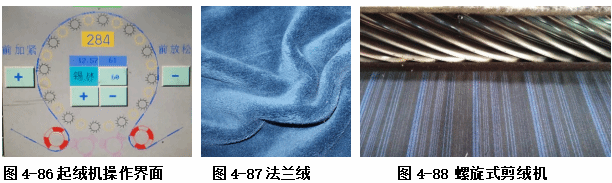(3)磨绒/起毛:利用石英砂纸从织物上挑出纤维,赋予织物绒面效果,也可利用钢针从机织或针织物上挑出纤维(毛)。用于棉织物的绒布(法兰绒)和粗纺毛织织物的起绒(起毛)工序。起绒机操作界面如图4-86,法兰绒如图4-87。