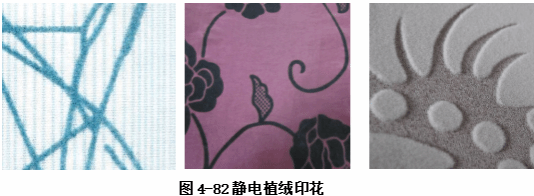 植绒布是利用高压静电场在坯布上面栽植短纤维的一种产品,即在承印物表面印上粘合剂,再利用一定电压的静电场 使短纤维垂直加速植到涂有粘合剂的坯布上,如图4-82,亦可参见本书第五章第二节。