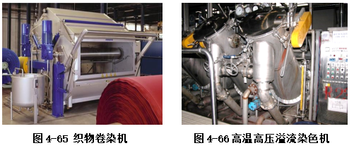 (1)间歇式工艺——卷染机(天然纤维织物):是最常用的染色方法。因染料在一定时间内从染浴向纤维转移,所以间歇式染色有时被称为竭染。在染色时间内,染料扩散或迁移进入纤维内部并固着。随着染料在纤维内的聚集,染浴内初始浓度较高的染料逐步耗尽。间歇式染色工艺一般采用织物卷染机(见图4-65)常用于结构紧密的。或轻薄织物染色,尽管机器产生的张力相对较大,但织物不会变形。卷染机工作时浴比非常低,产生的张力相对较高,因此非常适合于用亲和力不高的染料染棉机织物。