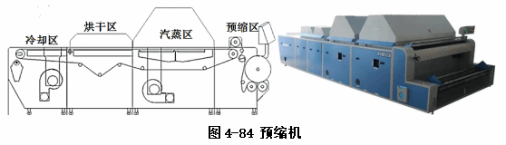 机械预缩是把织物先经喷蒸汽或喷雾给湿,再施以经向机械挤压,使屈曲波高增大,然后经松式干燥。预缩后的棉布缩水率可以降低到1%以下,并由于纤维、纱线之间的相互挤压和搓动,织物手感的柔软性也会得到改善。毛织物可采用松弛预缩处理,织物经温水浸轧或喷蒸汽后,在松弛状态下缓缓烘干,使织物经、纬向都发生收缩,预缩机示意图和设备如图4-84。