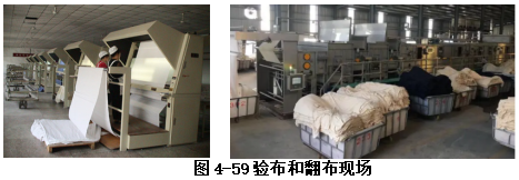 在进行加工之前,坯布都会在坯布间检查是否有错织、污垢、损坏和其他疵点。如果发现问题,将及时采取措施,以保证最终产品的质量,避免损失。由于坯布量大,通常只有10%左右的货物被抽检。检验内容包括规格和质量两个方面。坯布的规格检查包括长度、宽度、重量、经纬度、密度、强度等指标。坯布的质量检验主要是指纺纱和织造过程中形成的疵点,如断头、断纬、漏纱、棉结、油纱、筘路等。验布和翻布现场如图4-59。
