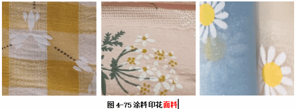 涂料印花,业内称胶浆印花、颜料印花,印花色浆通过胶粘剂附着在织物表面,色彩鲜艳,成本低廉,但手感透气稍差。工艺步骤是将有色图案印到织物表面,并将已印花的区域在空气中加热焙烘。印花浆料中含有色颜料和粘合剂。在热空气中焙烘时,粘合剂形成紧密的聚合物透明膜,它将颜料按图案要求固定在纱线表面。颜料印花的最大优点是固色加工以后织物无需洗涤处理,如图4-75。