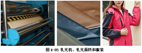 (2)轧光:织物通过两个重压罗拉的压缩,使织物外表平整、光滑,对于冲锋衣、夹克等服装,雨珠和雪花容易滑落。轧光机、轧光面料和服装如图4-85。