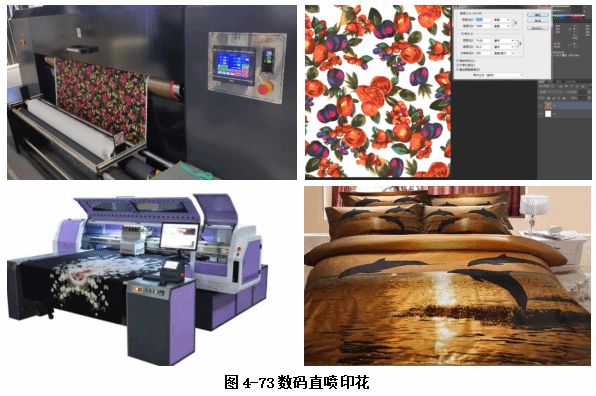 业内称数码直喷,通过喷墨印花的方式,无套色限制,可以印制照片,印花套色几乎无限制,色彩丰富、花型精细逼真、立体感强(如图4-73)具有小批量、多品种和反应快的特点。