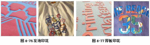 发泡印花是在色浆中加入发泡剂和热塑性树脂,经高温焙烘后,发泡剂分解释放出气体,使印浆膨胀而形成立体花型,并借助树脂将涂料固着而使织物获得各种具有浮雕感的花纹,如图4-76。