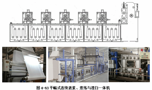 漂白目的是脱掉那些遮掩纤维本白的杂质。采用氧化剂漂白纤维。漂白过程须严格控制,以便既能使纤维中的色素遭到破坏,又能使由于纤维素纤维的氧化作用造成的损伤降到最低程度。连续式平幅退浆、煮练与漂白一体机如图4-63。