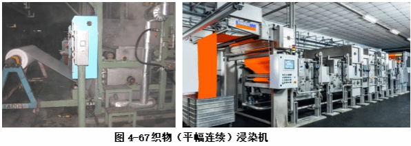 浸轧染色机(俗称平缸机,如图4-67),采用连续染色工艺,常用于加工大量的能承受张力和压力的织物。浸轧染色的过程包括:先将织物通过染浴,然后经轧辊将多余的染料榨出,再进入蒸汽或加热箱内固色。