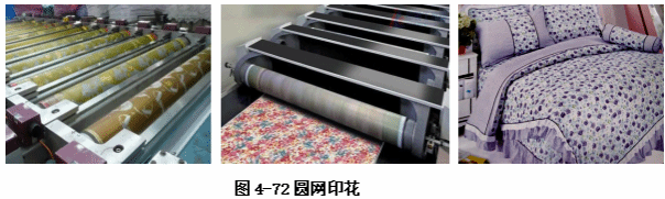 圆网是印花机的花版。由镍金属制造,能承受印花时色浆和刮刀的压力。每一圆网都配有给浆系统。 套色数等于圆网(刻花金属辊)数,如图4-72。