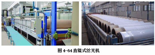 用浓氢氧化钠溶液处理棉织物的过程称为丝光。丝光是一种应用于纤维素纤维,尤其是棉的化学整理。用碱处理棉织物有许多优良效果,包括:增加织物光泽(如果在张力下进行)和柔软度,增加强度,提高对染料亲和力,提高未成熟纤维的可染性,并获得高吸水性,直辊式丝光机生产现场如图4-64。