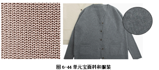 1.单元宝面料:也叫半畦编、单鱼鳞,单元宝面料集圈只在一个针床形成,一面线圈有悬弧,另一面线圈没有悬弧,两个横列完成一个花型循环,由于结构不对称,织物两面具有不同的密度和外观,由于下机后集圈悬弧力图伸直,使与悬弧相邻的线圈呈圆形鱼鳞状,单元宝面料丰满、厚实,宽度较大,常用于秋冬季毛衫等针织服装或帽子、围巾等针织服饰,如图6-44所示。