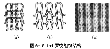 罗纹组织是由正面线圈纵行和反面线圈纵行以一定组合相间配置而成。图6-18为由一个正面线圈纵行和一个反面线圈纵行相间配置而形成的1+1罗纹组织,图中(a)是自由状态时的结构,(b)是横向拉伸时的结构,(c)是面料实物。