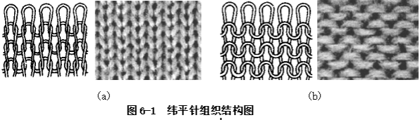 纬编基本组织包括纬平针组织,罗纹组织,双反面组织及其变化组织。纬平针组织又称平针组织,是单面纬编针织物中的基本组织,其正反面结构如图6-1(a)和(b)所示。它由连续的、结构相同的单元线圈向一个方向串套而成。