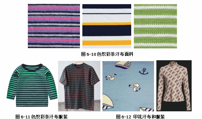 (5)色织彩条汗布:在不同路数的纱嘴穿不同颜色的纱线可以形成条纹效果汗布,条纹的宽度和配色可根据设计调整。色织彩条汗布和服装如图6-10和6-11。